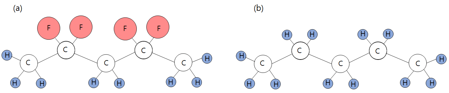 분극의 개념은 핵에 속박된 전자의 쏠림에서 분자내에 전하(charge)가 쏠리는 현상으로도 확장할 수 있습니다. Fig 2의 (a)를 보시면 분자 내에 불소(fluorine) 원자는 전기 음성도(electronegativity)가 높아 분자의 전자들을 끌어당기는 성질이 있습니다. 반면 수소(hydrogen) 원자는 전기 음성도가 낮아 분자의 전자들을 잘 끌어당기지 못합니다. 그래서 가운데 탄소(carbon)원자들을 중심으로 불소원자가 있는 쪽은 음전하의 성질을 강하게 갖고, 전자가 불소 원자 쪽으로 쏠려버렸기 때문에 수소원자가 있는 쪽은 양전하의 성질을 강하게 갖습니다. 이때 외부에서 전기장이 가해지면 불소 원자 쪽은 +극판 쪽으로, 수소원자 쪽은 -극판 쪽으로 강하게 쏠리는 현상이 발생합니다.