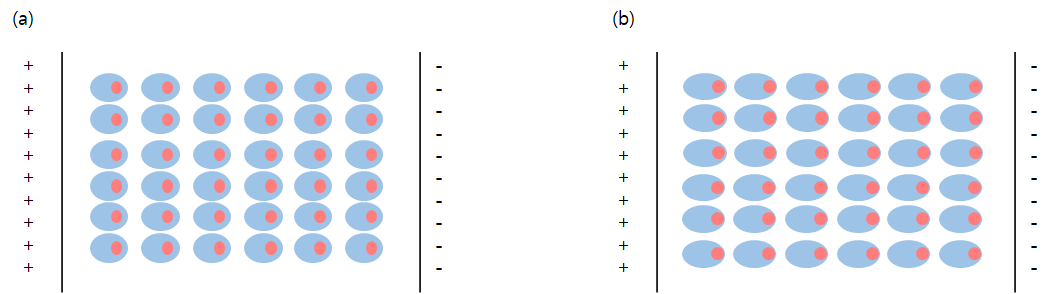 유전율이 높은 물질은 분극(polarization)이 잘 됩니다. 분극이란 Fig1에서 처럼 외부에서 전기장이 가해질 때 핵에 속박된 전자가 한쪽으로 쏠리는 현상을 말합니다. Fig1의 (b)가 (a) 보다 전자가 더 쏠렸기 때문에 (b)가 더 분극이 더 잘되는 상황입니다.