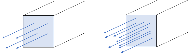 이번에 소개 할 개념은 전기장 (electric field)를 배울 때 같이 알아두면 좋은 전기선속 (electric flux)의 개념입니다. 전기장은 electric flux로 표현이 될 수 있습니다. flux의 개념은 전자기학 이외에 유체역학 등에서도 등장하는 개념입니다. 우선 flux는 '단위 시간당 표면을 수직으로 통과해 흘러나가는 어떠한 양'으로 정의 됩니다. 만약 어떠한 관에 흐르는 물의 흐름을 flux를 이용해 아래 Fig 1에 나타나 있다고 가정 한다면, Fig 1의 왼쪽 그림에서 물의 수압이 오른쪽 그림보다 약해서 왼쪽 그림에서 물의 흐름이 상대적으로 적은 상황이라고 볼 수 있습니다. 또 다른 가정으로 만약 질소 기체가 관에서 확산되고 있는 모습을 flux를 이용해 Fig 1에 나타나 있다고 가정한다면 왼쪽 그림에서 질소기체의 흐름이 오른쪽 그림보다 더 적은 상황이라고 볼 수 있습니다.